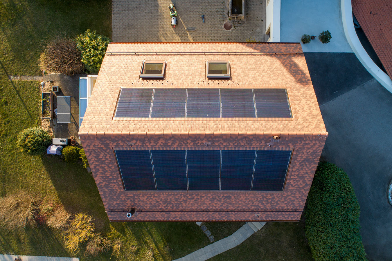 Démontage de la toiture existante, réfection de toute l’isolation de la toiture y compris de la barrière vapeur, pose d’une nouvelle couverture et de nouvelles ferblanteries, remplacement des fenêtres de toit Velux ainsi que de leur store et installation de tuiles solaires FIT 54 de la maison Gasser Ceramic.