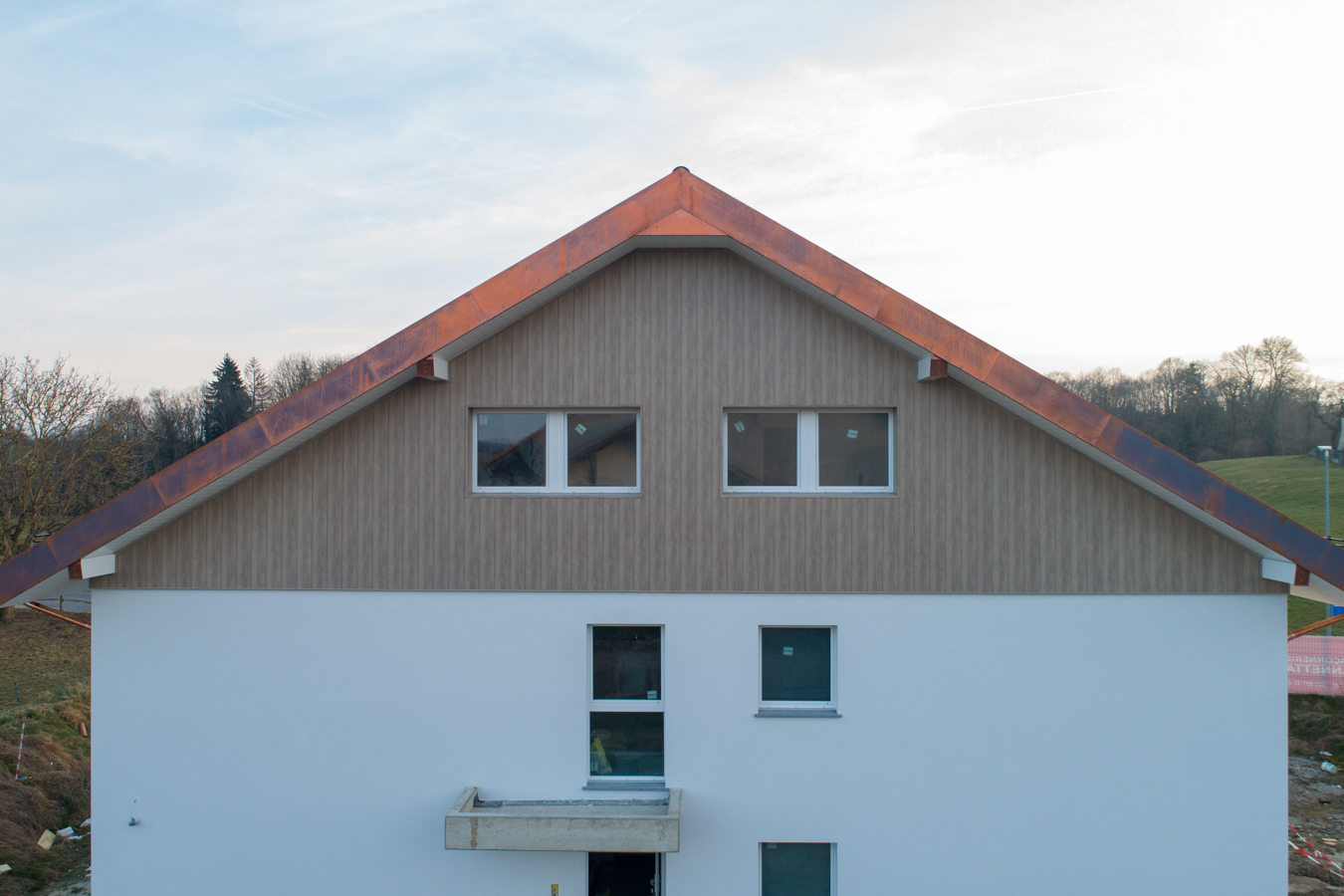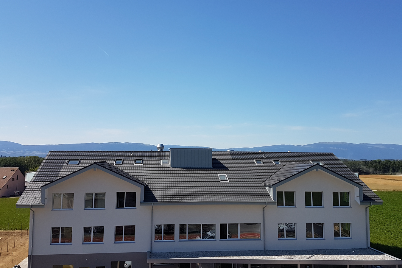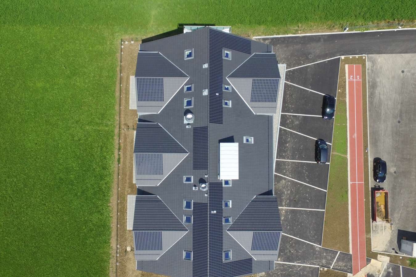 Nous avons réalisé la rénovation du hall de la salle de gym d’Etagnières avec une couverture en placage métallique PREFA anthracite avec intégration de 14 velux et d’une installation solaire photovoltaïque de la marque PREFA permettant un résultat esthétique optimal.